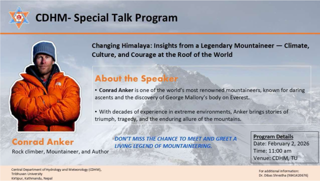 Central Department of Hydrology and Meteorology (CDHM), Tribhuvan University would like to invite you to a special talk by Legendary Mountaineer and author Conrad Anker, recipient of an Honorary Doctorate from the University of Utah, on “Changing Himalayas under a Warming World: Insights from mountaineers” on 2nd February 2026 at 10:30 AM (Monday).