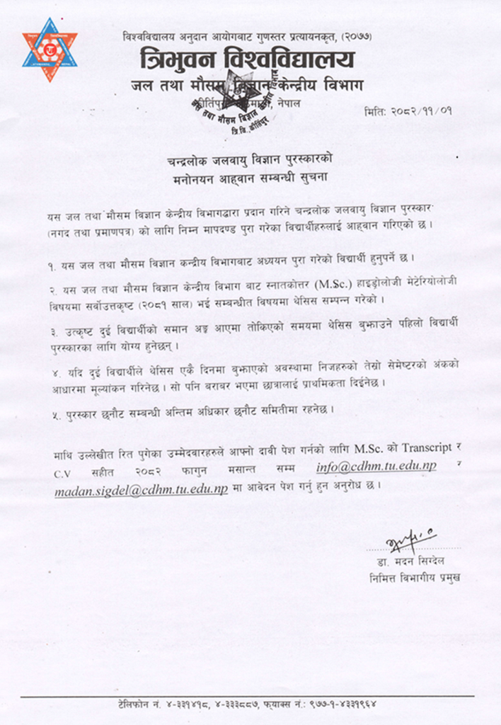 चन्द्रलोक जलवायु विज्ञान पुरस्कारका लागि निवेदन पेस गर्न आव्हान